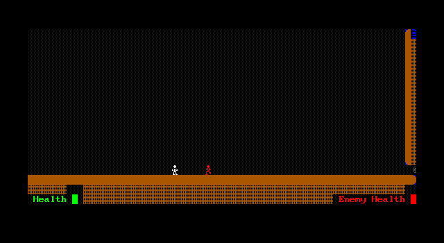 As far as 1x1 MZX fighting games go, this is probably the one with the most promise I've seen so far, even if it's incredibly broken. With some real jump physics, attacks that actually work (couldn't figure out how to punch and kick; the AI never jumped so I couldn't try to attack upwards), a decent AI or two player support, and better scenery (the fighter characters are drawn nicely), this would be worth playing. Bugs are mostly why this didn't get two stars -- if you attack the enemy too much (which is easy), they'll die pretty fast but their death label will get cancelled and you won't be able to continue (to an ending screen). The AI never looks to the right side of the screen (but still attacks you to the right, which is more than the ASCI Fighter games could shake a double dong at), and as mentioned before, the 4 and 5 buttons don't actually punch or kick, even when the enemy is right next to the player. Also, it's apparently a demo, or so it told me when it wouldn't let me go into Practice mode. Feh.