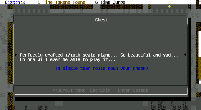 Lochronotran encompasses a lot of the special quirks that I think make MegaZeux games unique. Things are slightly out of place; other things are generalized and glazed over; the small details are emphasized in strange places, and sometimes logic is thrown to the wayside altogether. There's a lot of incongruity between what is and isn't interactive, pertinent or thematic. A comedic element emerges as these slightly off-kilter things add together to give you the feeling that you're playing an old MZX game. It's a palpable nostalgia, the way that the elements unique to this medium and this genre echo their predecessors.