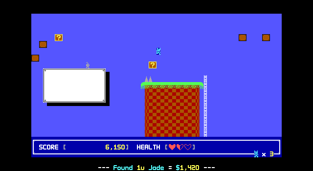 For the uninitiated, it's a simple, old-school sidescroller. You collect treasure (each item has its own worth depending on quality and type), jump on enemies and hit "?" blocks. You can deliberately fall through and jump through many platforms. Your character has a life meter as well as lives, which is helpful for a 1x1 sidescroller.